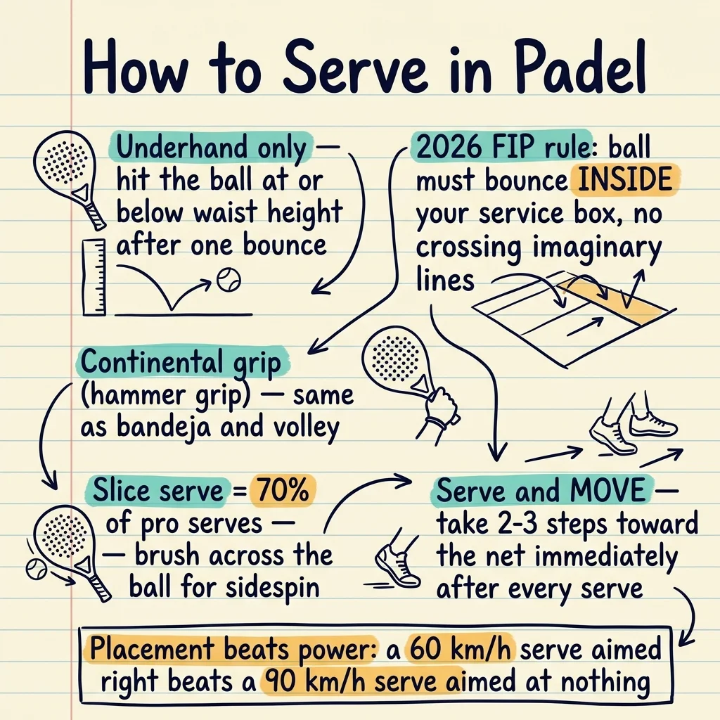 Domina el saque de pádel — técnica, colocación, slice vs plano, y las nuevas reglas FIP 2026 del servicio explicadas.