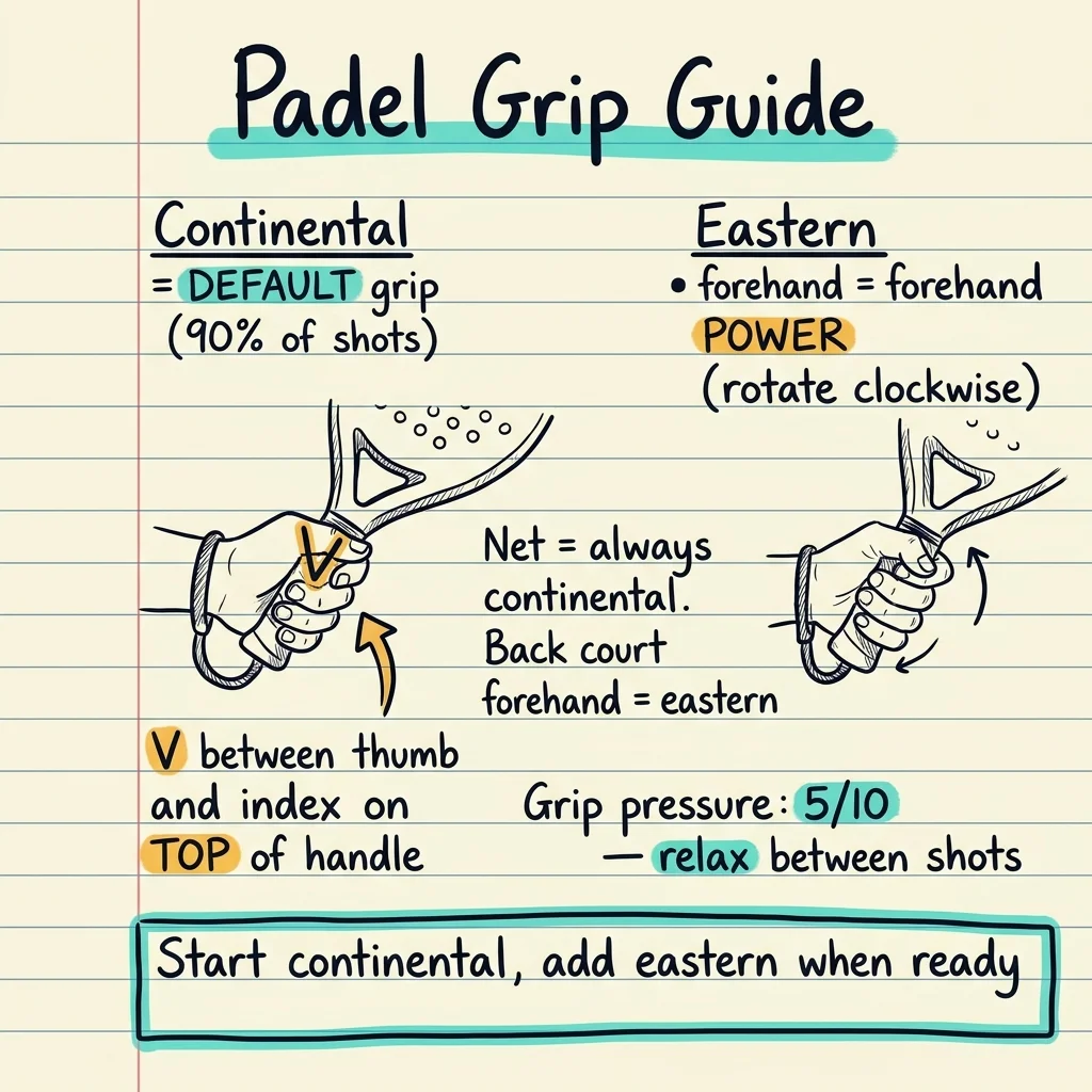 La empuñadura continental es la base del pádel — pero la eastern añade potencia en el drive. Cómo encontrar cada agarre y cuándo cambiar.