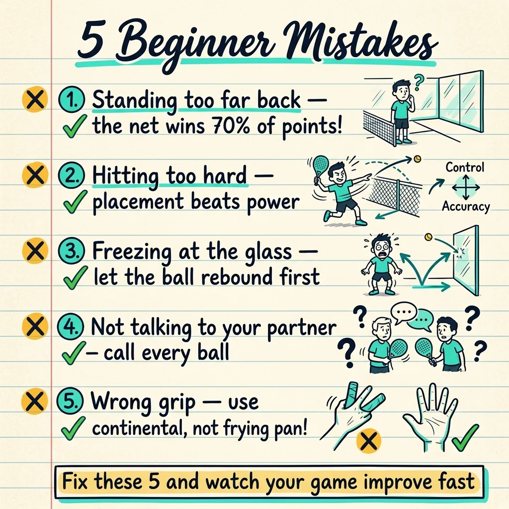 Los cinco errores que más puntos cuestan a los principiantes: quedarse demasiado atrás (pierdes la red, pierdes el punto), pegar demasiado fuerte (la colocación gana a la potencia — el 80% de los puntos son errores, no golpes ganadores), bloquearse con los cristales (deja que la bola salga del cristal, luego golpea), no hablar con tu pareja (canta cada bola o dejaréis huecos) y usar la empuñadura equivocada (la de sartén mata tu juego de red — usa la continental).