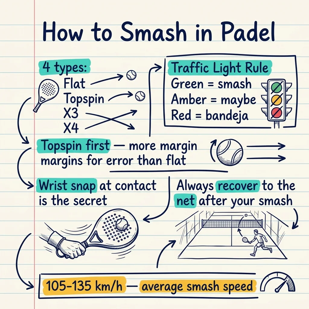 Aprende los cuatro tipos de remate en pádel — plano, con efecto, x3 y x4. Cuándo usar cada uno, técnica paso a paso y errores comunes.
